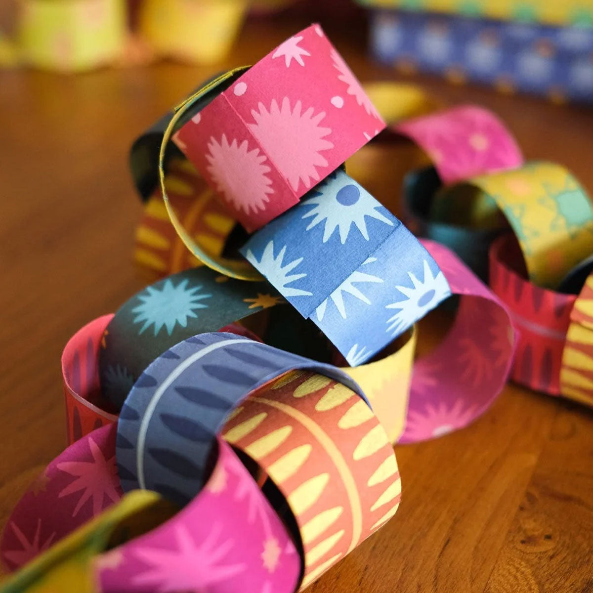 East End Press paper chain kits contains 160 strips of recycled, patterned pink and red paper strips which, when assembled, create ten metres of beautiful paper chains. Simply use glue or staple each loop to the next to create a classic party decoration. The paper is printed by hand on both sides so your paper chains always look great!
