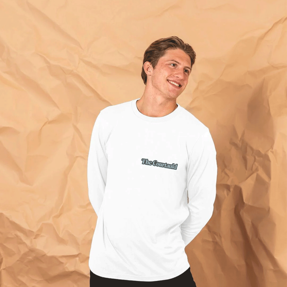 Courtauld branded, soft touch, certified organic cotton long sleeved t-shirt. Available in a classic grey marl or white with pale blue logo.